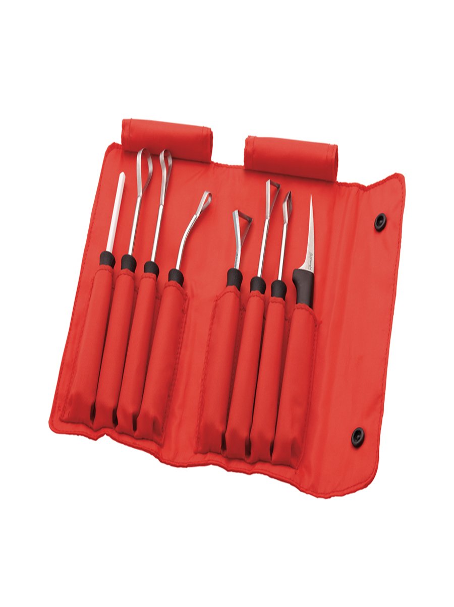 Ξεκινήστε να χαράζετε φρούτα και λαχανικά με επιτυχία. Μάθετε και εξασκηθείτε σε βασικές τεχνικές χάραξης χρησιμοποιώντας αυτά τα 8 εργαλεία χάραξης. Όλα τα εργαλεία είναι κατασκευασμένα από συμπιεσμένο ανοξείδωτο ατσάλι ενώ τα χερούλια είναι κατασκευασμένα από πολυπροπυλένιο το οποίο είναι ασφαλές στη χρήση με τρόφιμα. Τα βασικά σημεία επαφής είναι από αντιολισθητικό Santoprene. Κατασκευή Σόλινγκεν, Γερμανίας.