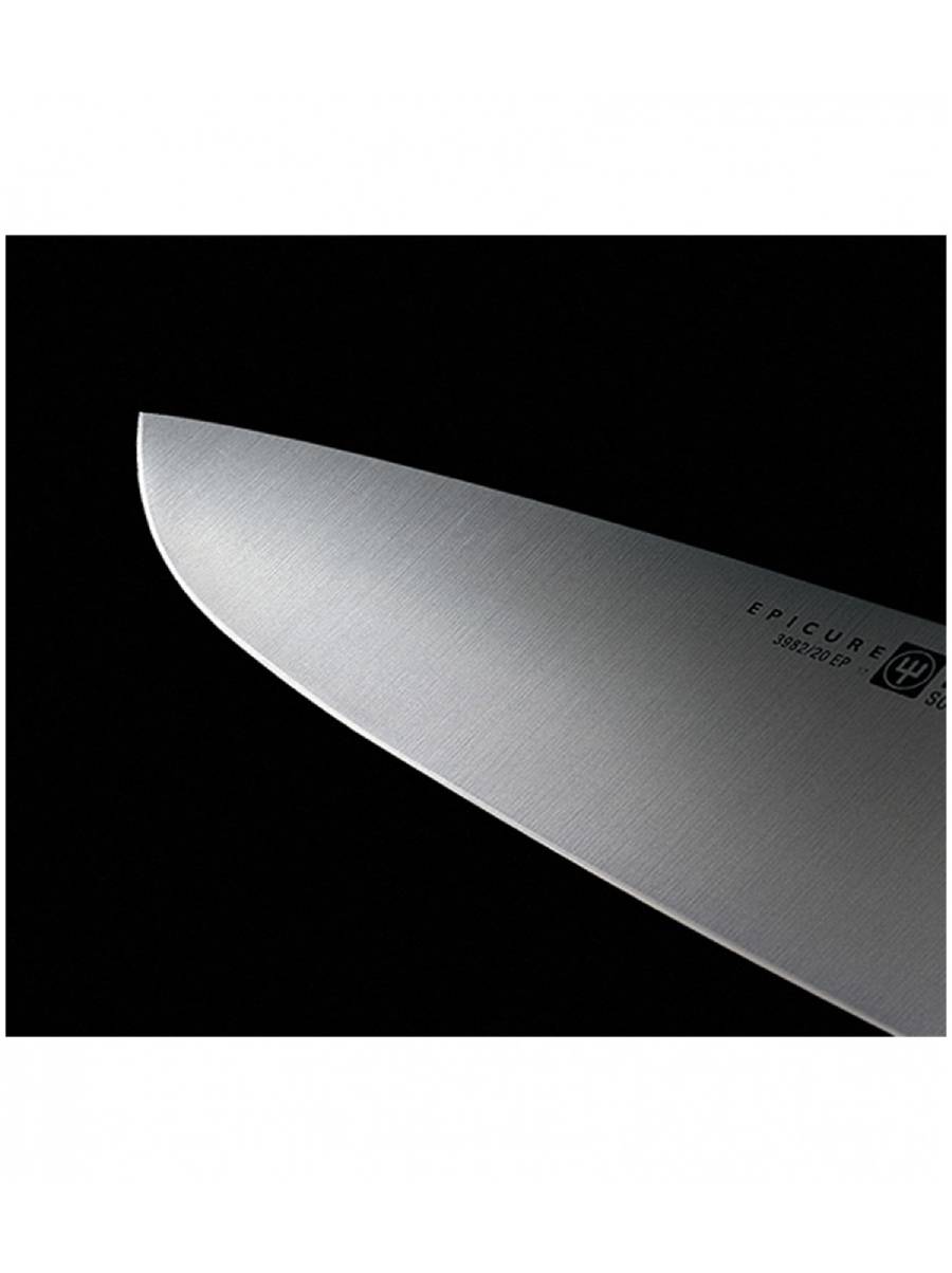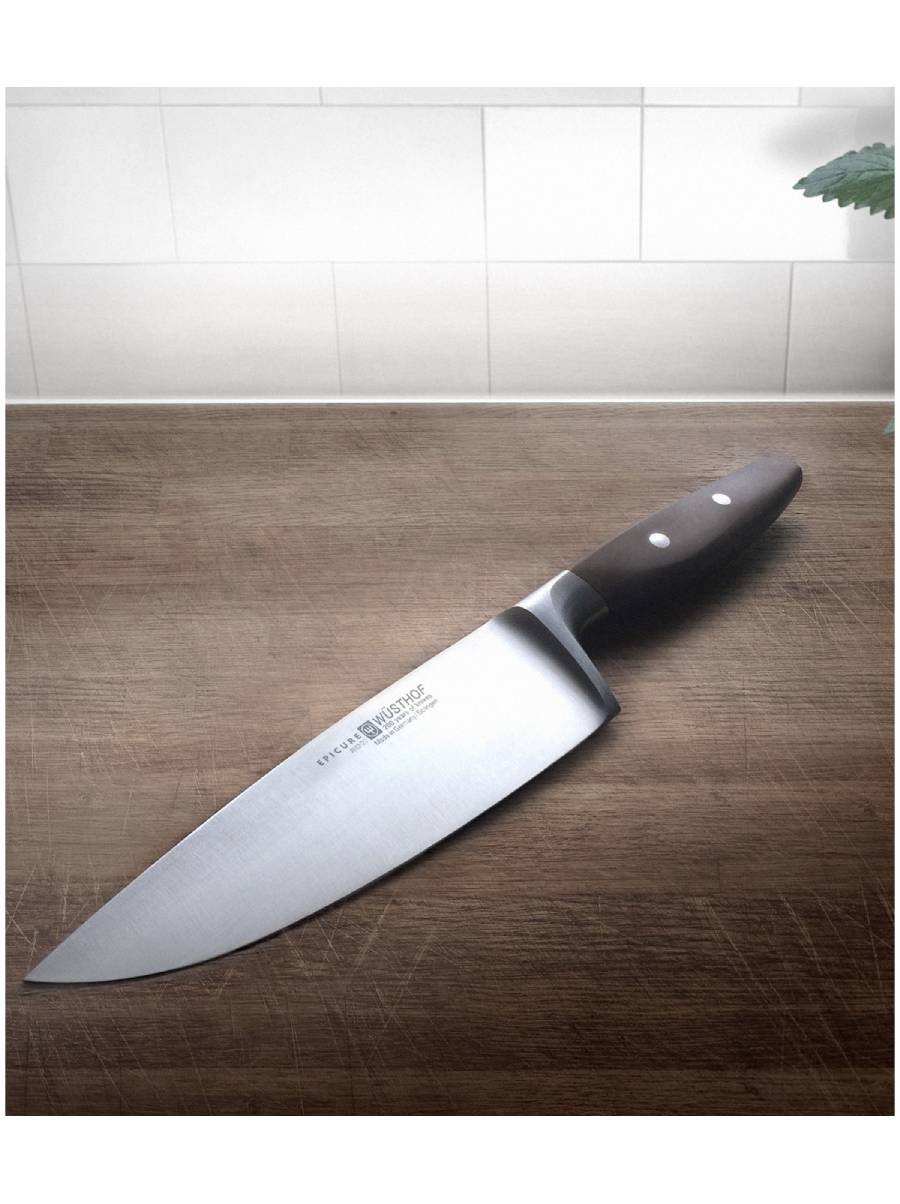 Το μαχαίρι Wusthof Epicure είναι ιδανικό για τον σεφ και γενική χρήση στην κουζίνα. Είναι το πιο χρήσιμο από όλα τα μαχαίρια στην κουζίνα. Πρόκειται για μια χειροκίνητη μηχανή μαγειρέματος και αποτελεί την επέκταση του χεριού κάθε επαγγελματία μάγειρα. Σε όλα τα μαχαίρια της σειράς Epicure θα ανακαλύψετε μία τέλεια μίξη Ιαπωνικής και Γερμανικής φιλοσοφίας. Το στήθωμα εξασφαλίζει απόλυτη ισορροπία ενώ παράλληλα σας δίνει τη δυνατότητα να κόβετε ακούραστα για μεγάλη διάρκεια. Ακρίβεια στην κόψη και αποτελεσματικότητα είναι τα βασικά χαρακτηριστικά της πλατιάς λάμας. Λαβή κατασκευασμένη από φυσικές ίνες και ρητίνη- τόσο ντελικάτη όσο και μια ξύλινη. Απόλυτη δεινότητα κοπής χάρη στην "Petec" τεχνολογία της Wusthof. Δεν πλένεται σε πλυντήριο πιάτων.
