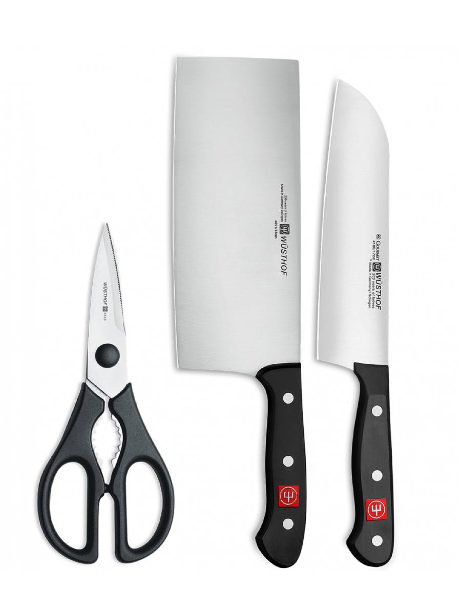 Το σετ μαχαιριών Wusthof Gourmet είναι ιδανικό για λαχανικά και γενική χρήση. Είναι το πιο χρήσιμο από όλα τα μαχαίρια στην κουζίνα. Πρόκειται για μια χειροκίνητη μηχανή μαγειρέματος και αποτελεί την επέκταση του χεριού κάθε επαγγελματία μάγειρα. Ιδανικό για κάθε είδους κοπές, τεμαχίζει γρήγορα και αποτελεσματικά σε λεπτές φέτες ή και κύβους κάθε είδους τροφίμων. Το στήθωμα ή αλλιώς Bolster (ένωση λαβής με λάμα) είναι ολόκληρο (full bolster) για περισσότερη ασφάλεια και σταθερότητα. Η λάμα είναι πιο πλατιά για εξειδικευμένες κοπές. Προσοχή, πρέπει να αποφεύγουμε τα κόκαλα. Περιλαμβάνει: Ψαλίδι κουζίνας. Μπαλταδάκι Λαχανικών 18 εκ. Μαχαίρι Santoku 17 εκ.